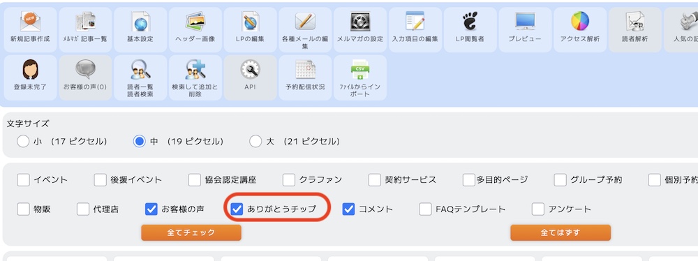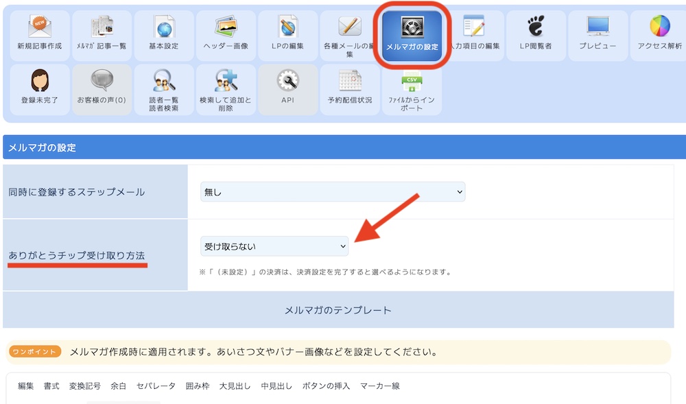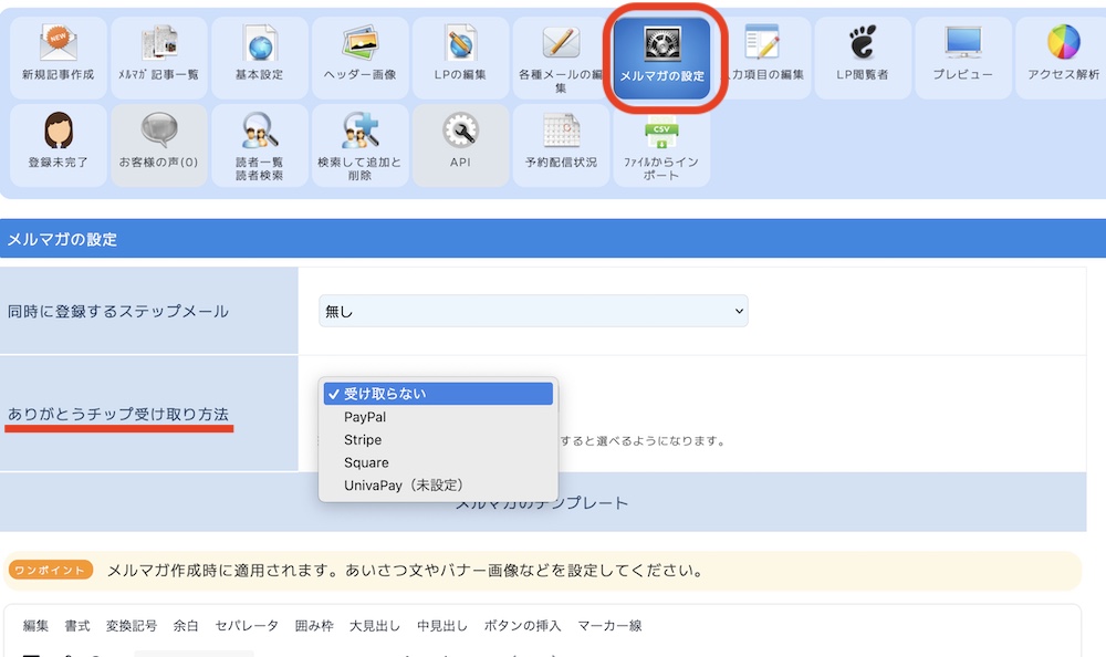 これをメルマガに表示させるために、先に【メルマガの設定】で【ありがとうチップ受け取り方法】を設定する必要があります。