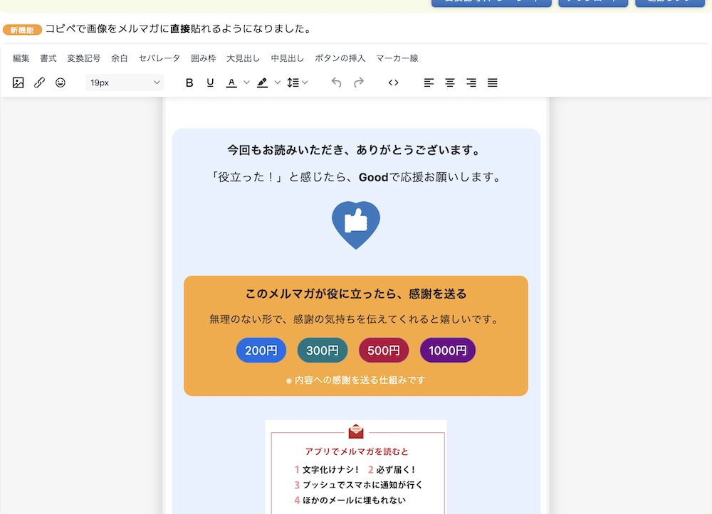 ここでPayPalやSquareなどの決済方法を設定しておくと、メルマガの本文に以下のような「内容への感謝の気持ちを伝えるありがとうチップの機能」が表示されます。