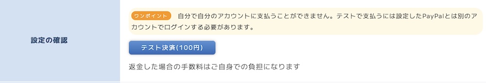 SquareやStripeでテスト決済する場合は、「返金した場合の手数料はご自身での負担になります。」
