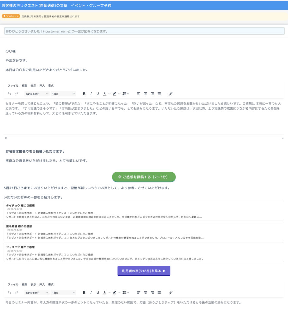 【設定】>【全体設定】>【メール全般】の設定の中に、『お客様の声リクエスト(自動送信)の文章 イベント・グループ予約』という項目があります。