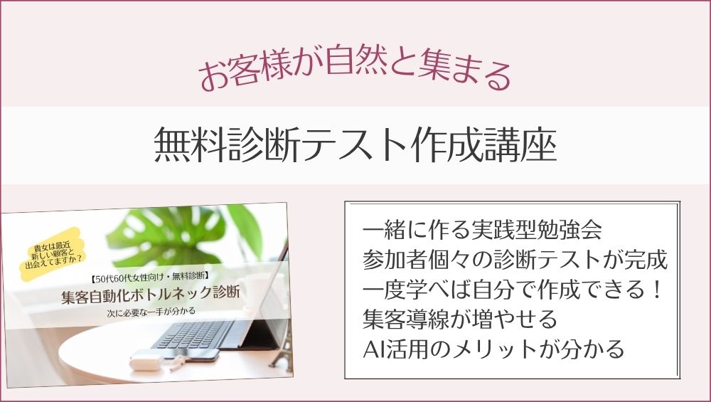 この講座は、Webが得意な方はもちろん、苦手な方でも「診断テスト」を作っていただき、集客の仕組みを一つ手に入れるための講座です。